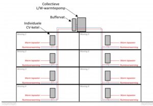 Het idee bleek even eenvoudig als doeltreffend. In plaats van iedere woning een eigen warmtepomp te geven, plaatst Breman één collectieve warmtepomp per ‘streng’ van vier ‘op elkaar gestapelde’ woningen. De bestaande cv-ketels blijven hangen, worden gebruikt voor warm tapwater in de keuken en de badkamer en kunnen bijspringen op piekmomenten of als het elektriciteitsnet overbelast raakt. Zo blijft het comfort gelijk, terwijl het aardgasverbruik drastisch daalt. “Bewoners hoeven hun woning niet uit, er zijn geen ingrijpende verbouwingen nodig en de energierekening gaat omlaag,” legt Mark uit. Het concept is speciaal ontwikkeld voor portiekflats tot vier verdiepingen hoog. Dit type gebouw staat in veel steden en er wonen vaak mensen met een kleinere portemonnee.